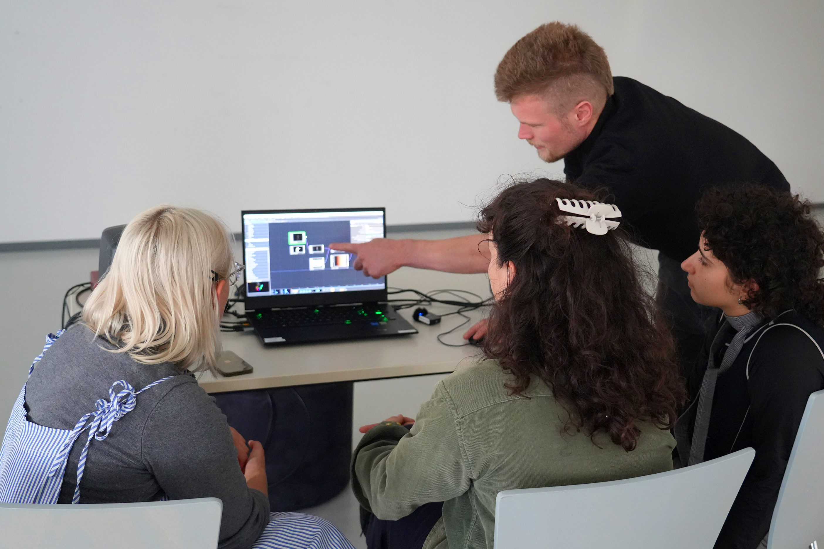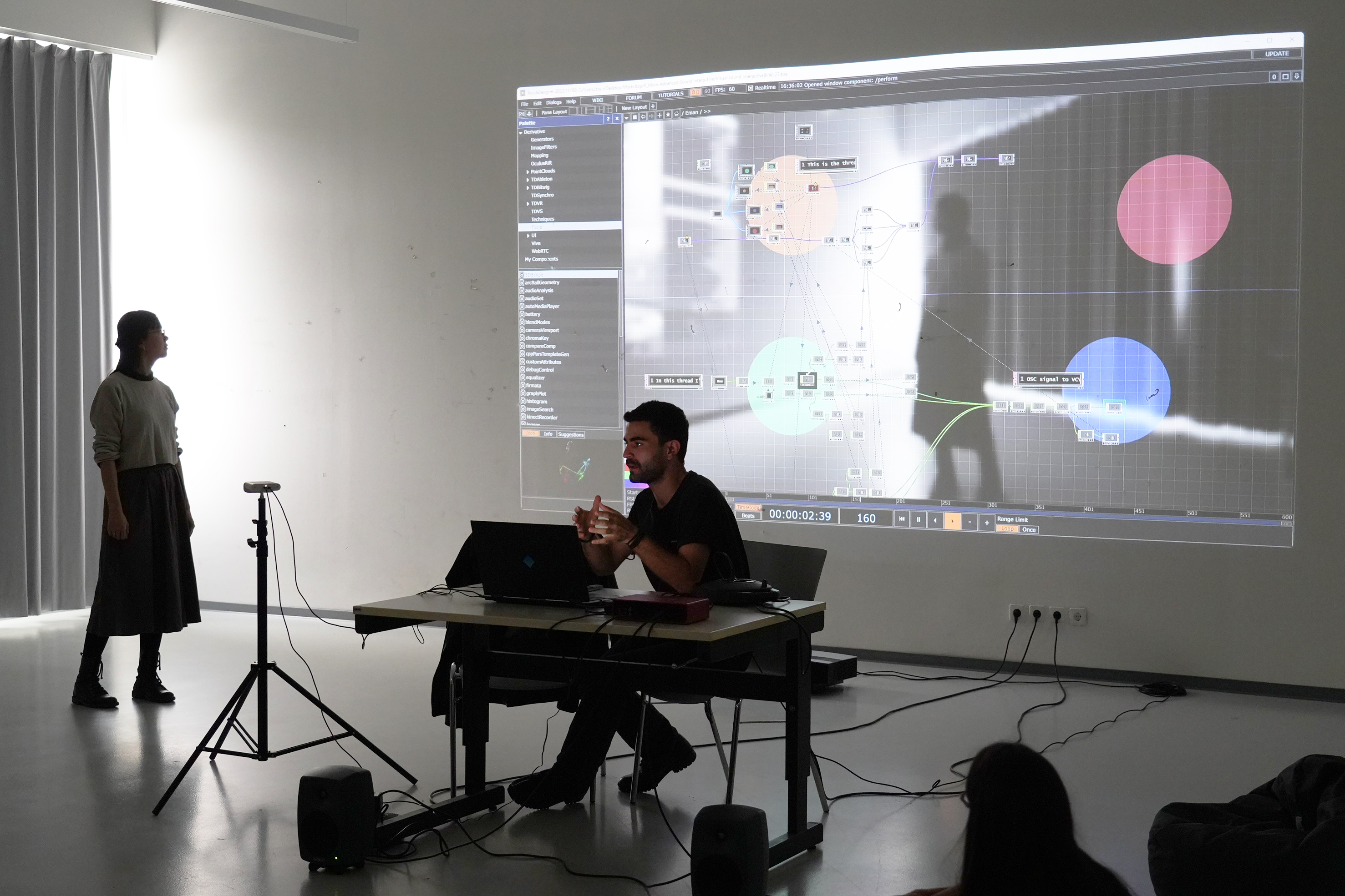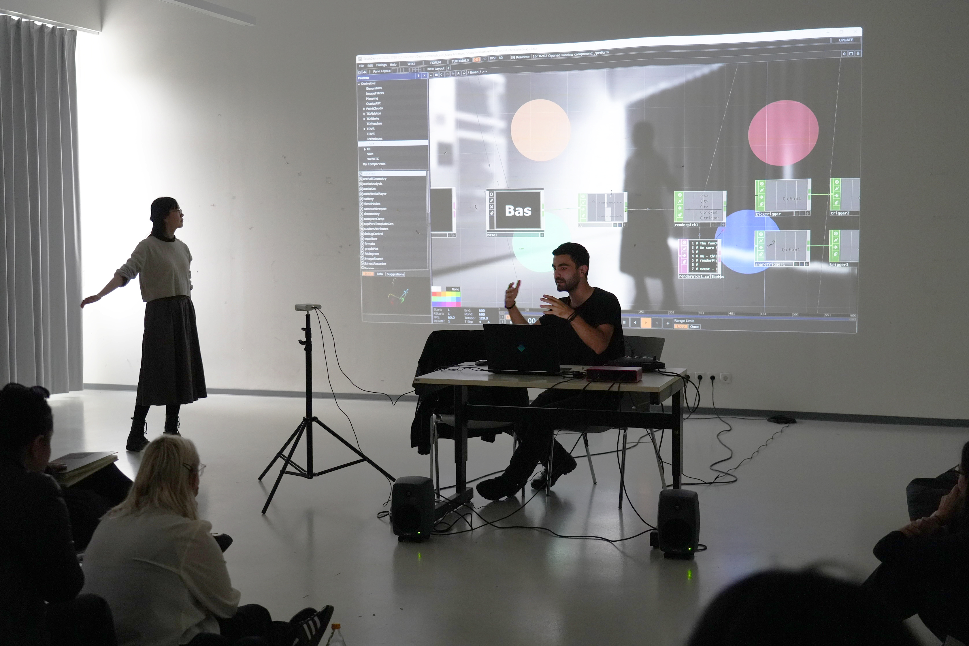 Structured over three days, the workshop balanced theoretical introductions, curated examples of motion-capture-based artistic projects, and hands-on experimentation. Participants first engaged with foundational concepts in motion-tracking and interactive media, followed by step-by-step tutorials and guided exercises in TouchDesigner. They then developed their own experimental patches and applied motion data to create interactive installations, performances, or visual experiments.