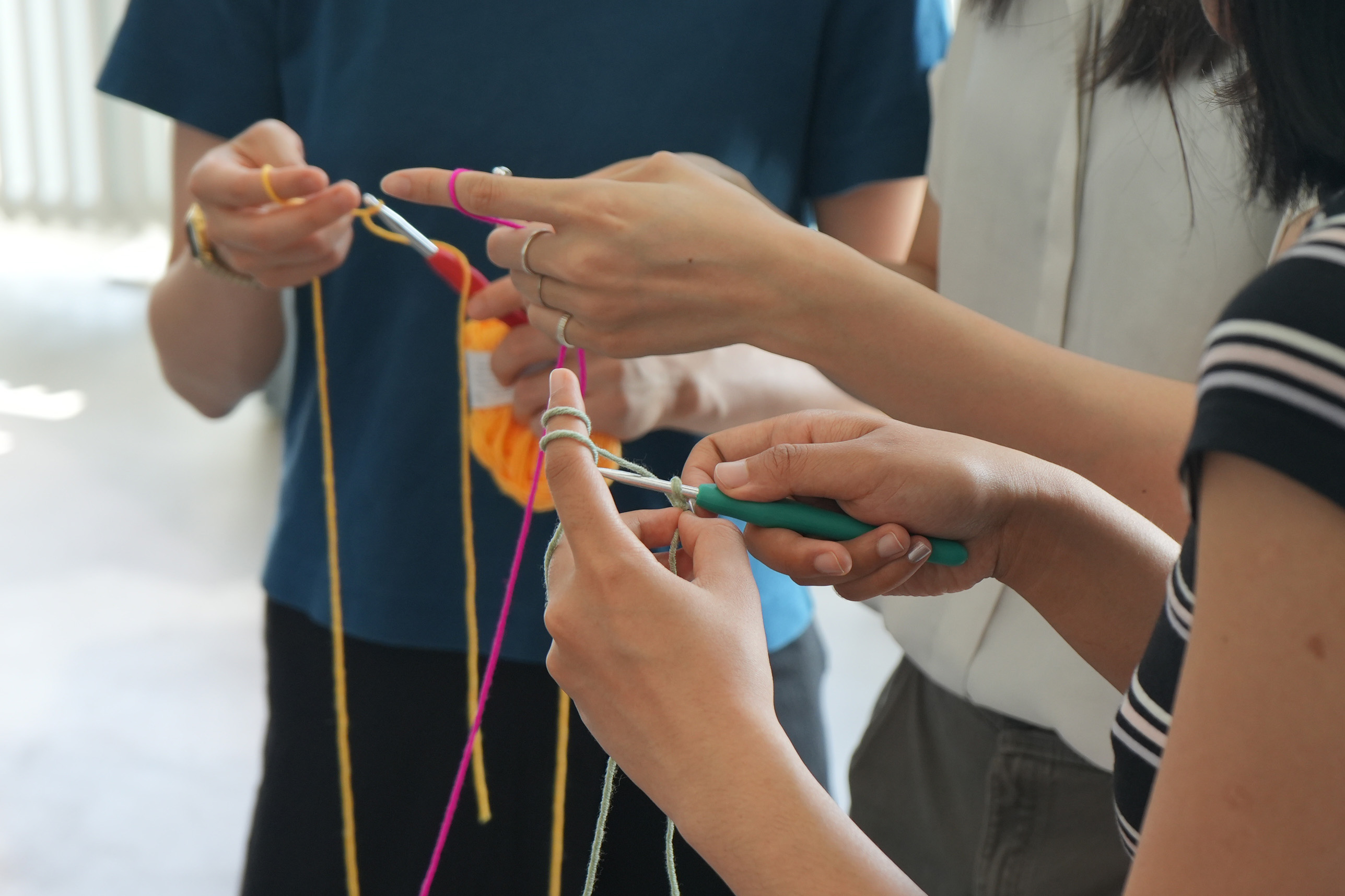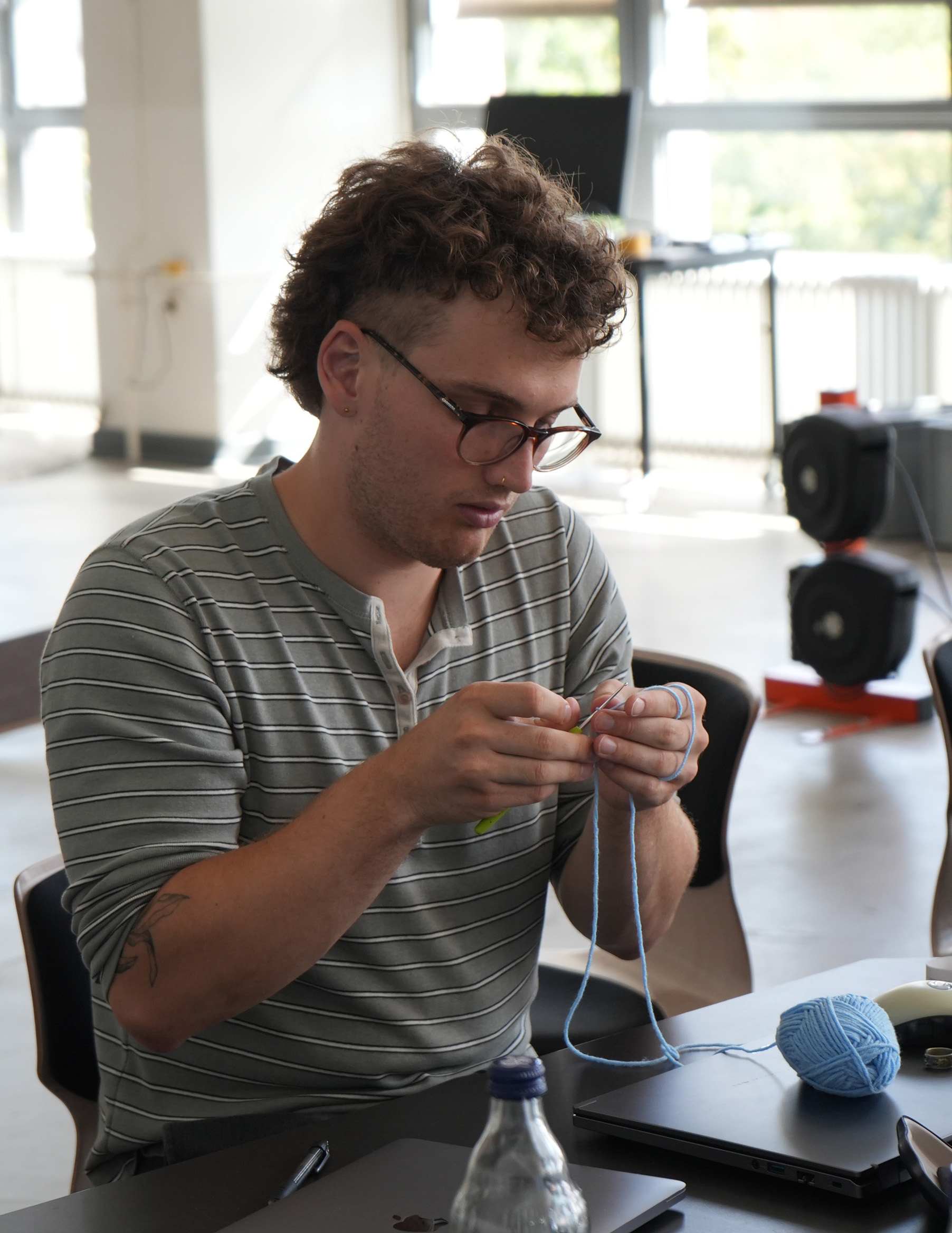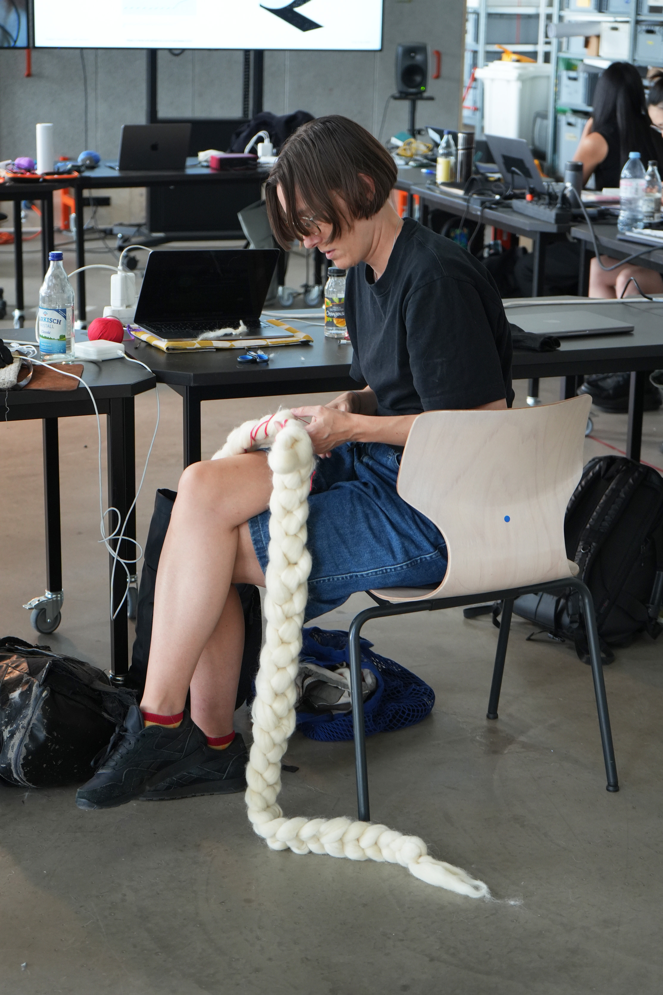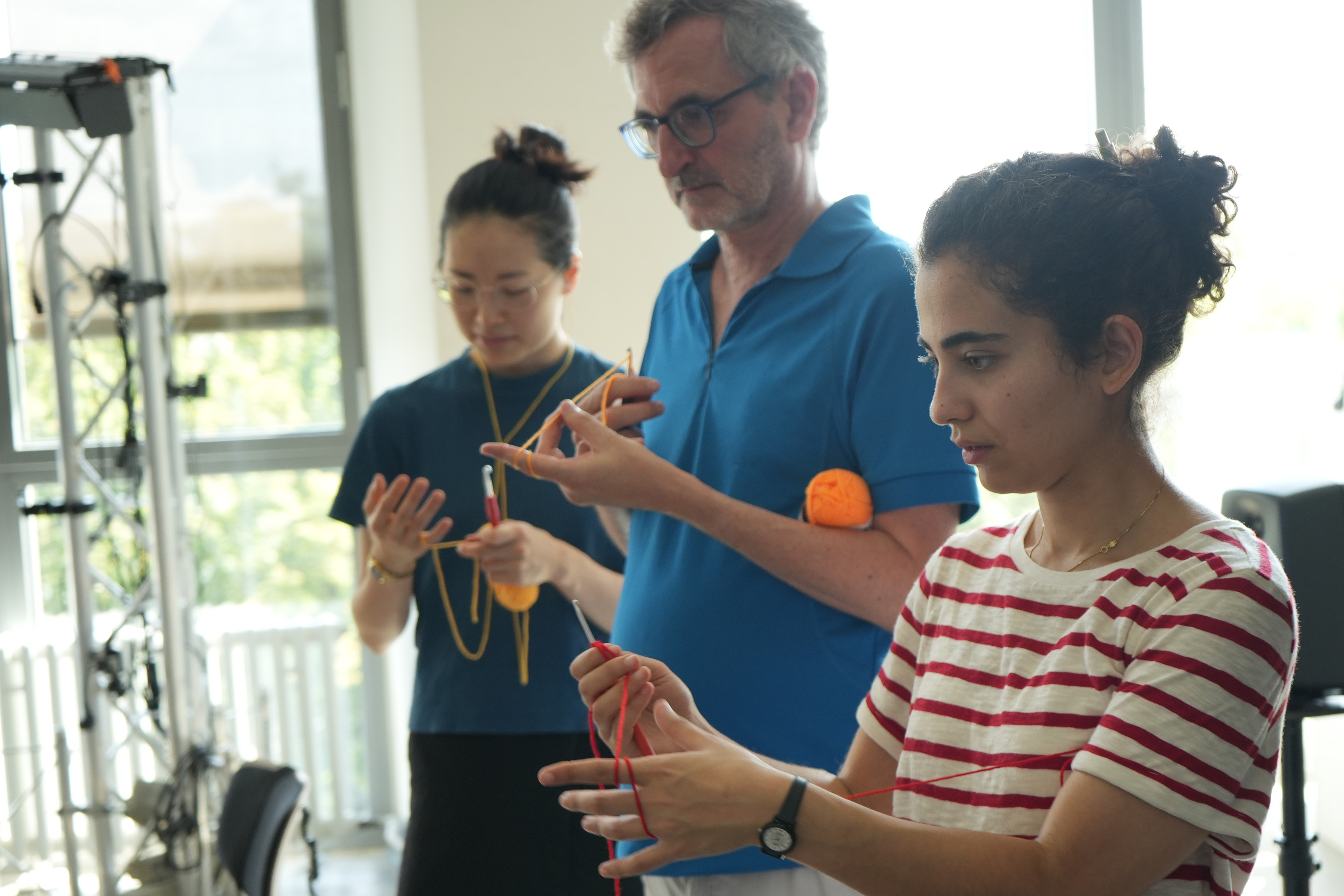 Guided by Magdalena Kohler, participants explored the properties of knitted textiles and different types of fibers, from natural materials like wool and cotton to synthetics such as polyamide and polyester, including conductive threads. Using sewing, knitting, crocheting, and I-cord techniques, they created soft sensors that transformed bodily movement into measurable electronic signals, embedding digital interaction within traditional craft practices.