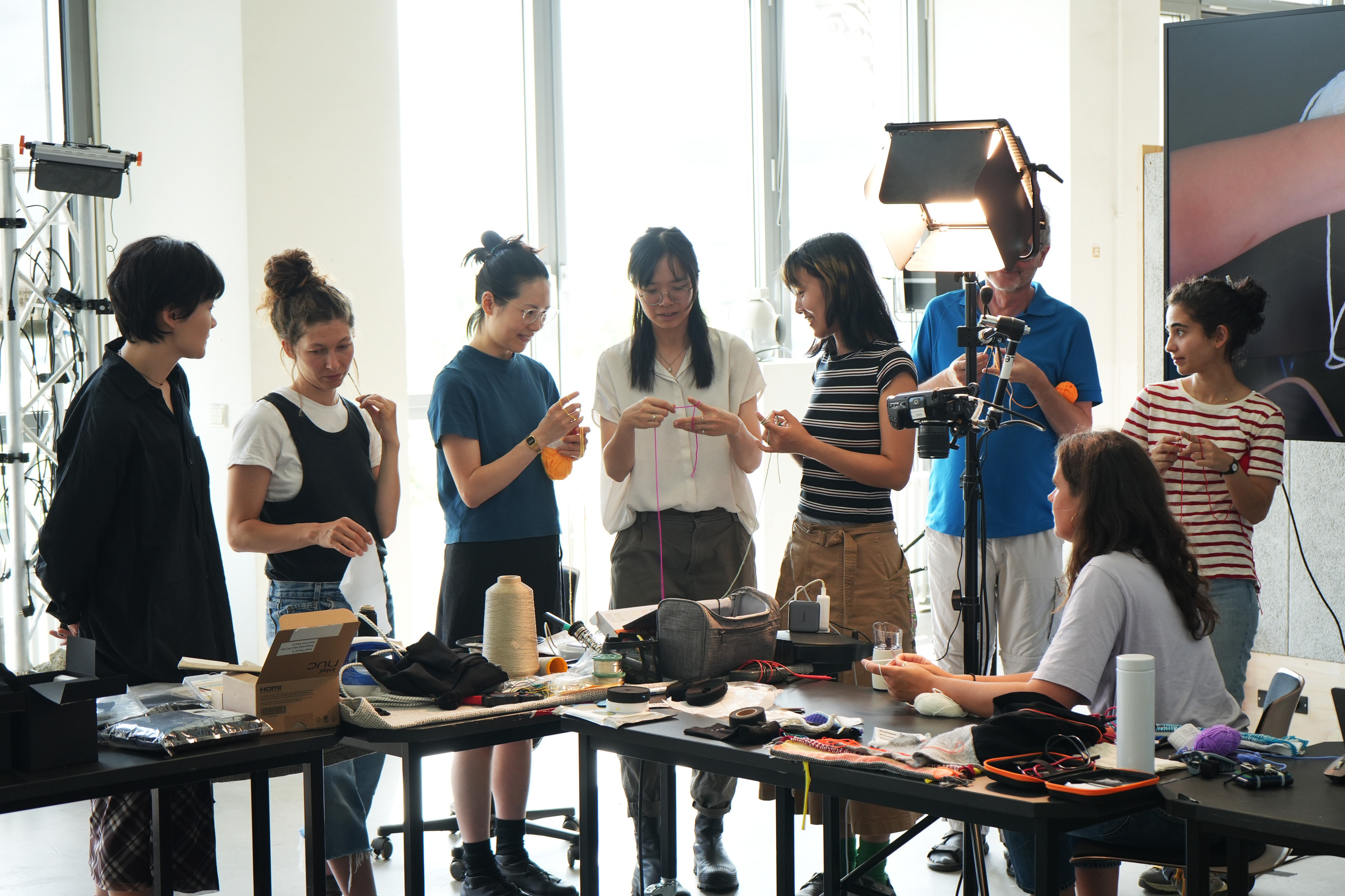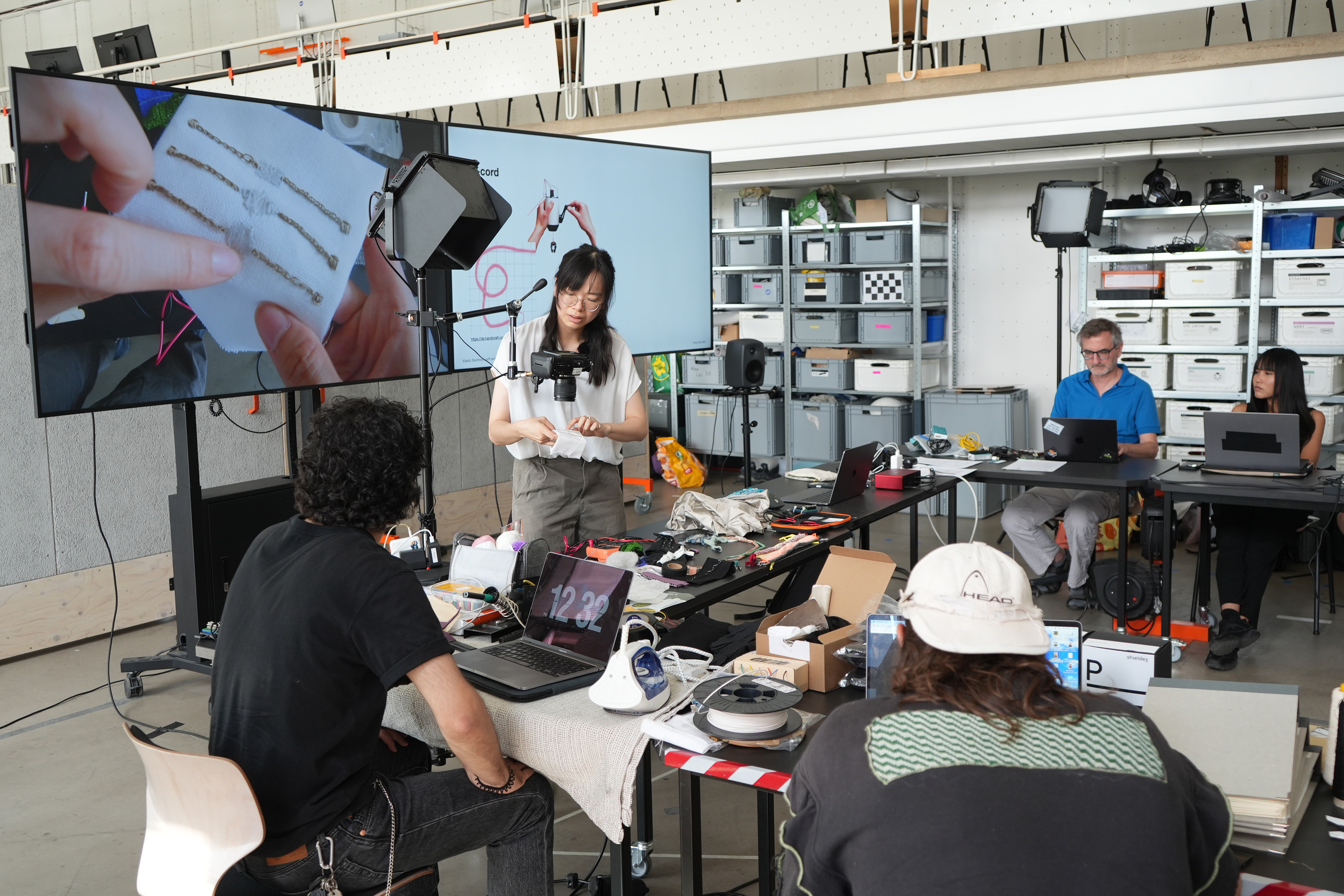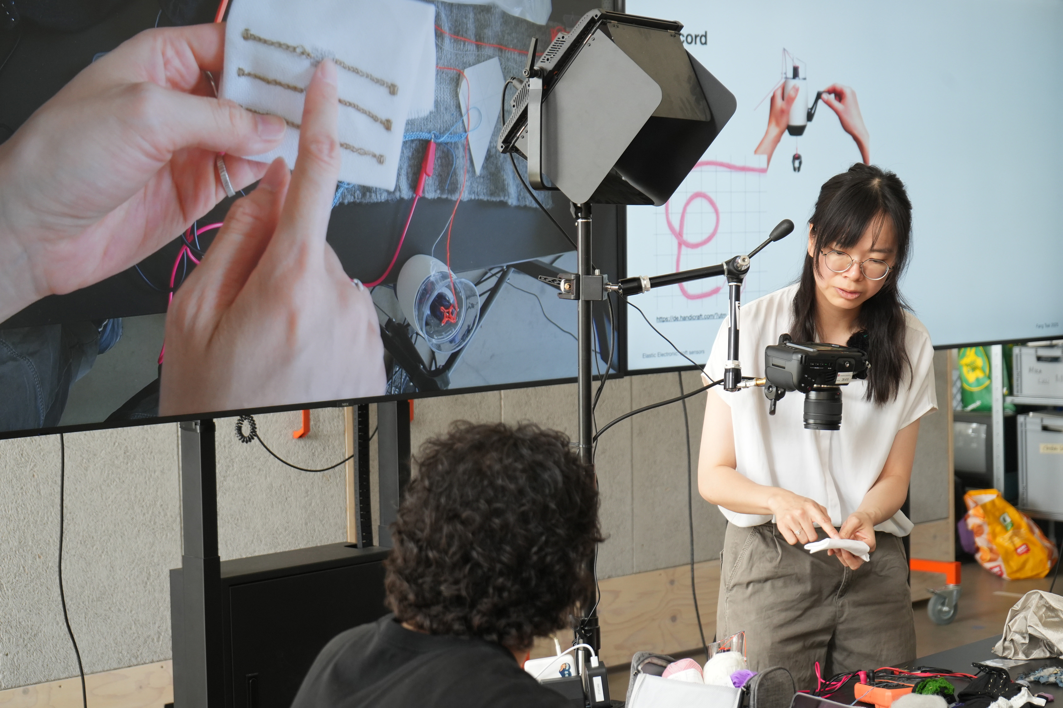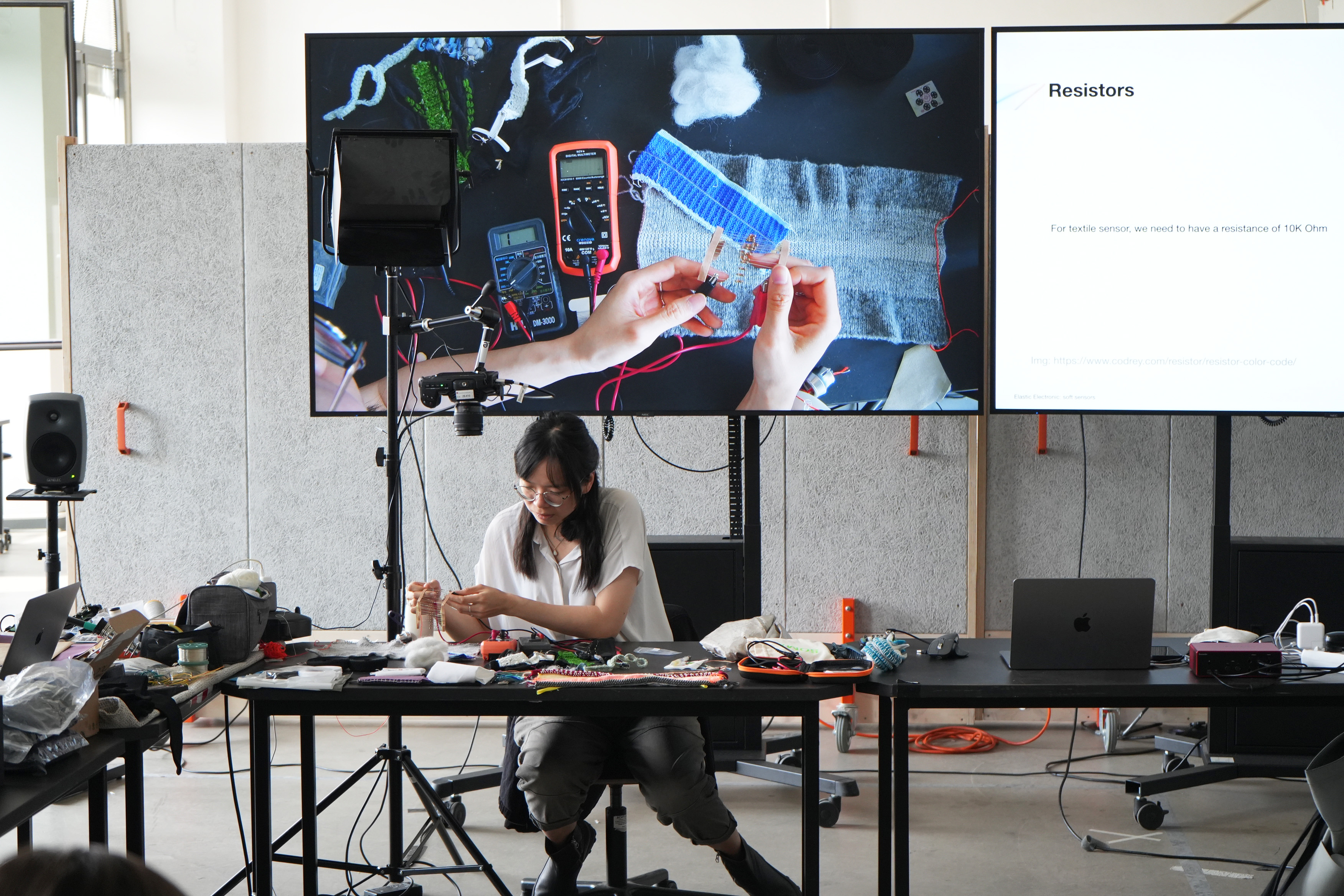 The workshop Elastic Electronic: Soft Sensors, hosted by Fang Tsai at the Design & Computation Studio of the Technical University of Berlin for student from Berlin University of the Arts, offered a hands-on exploration of the intersections between textiles, electronics, and sound. Designed as a transdisciplinary experience, it brought together students from visual communication, dance, product design, sound studies, and fine arts, encouraging collaboration across creative and technical fields.