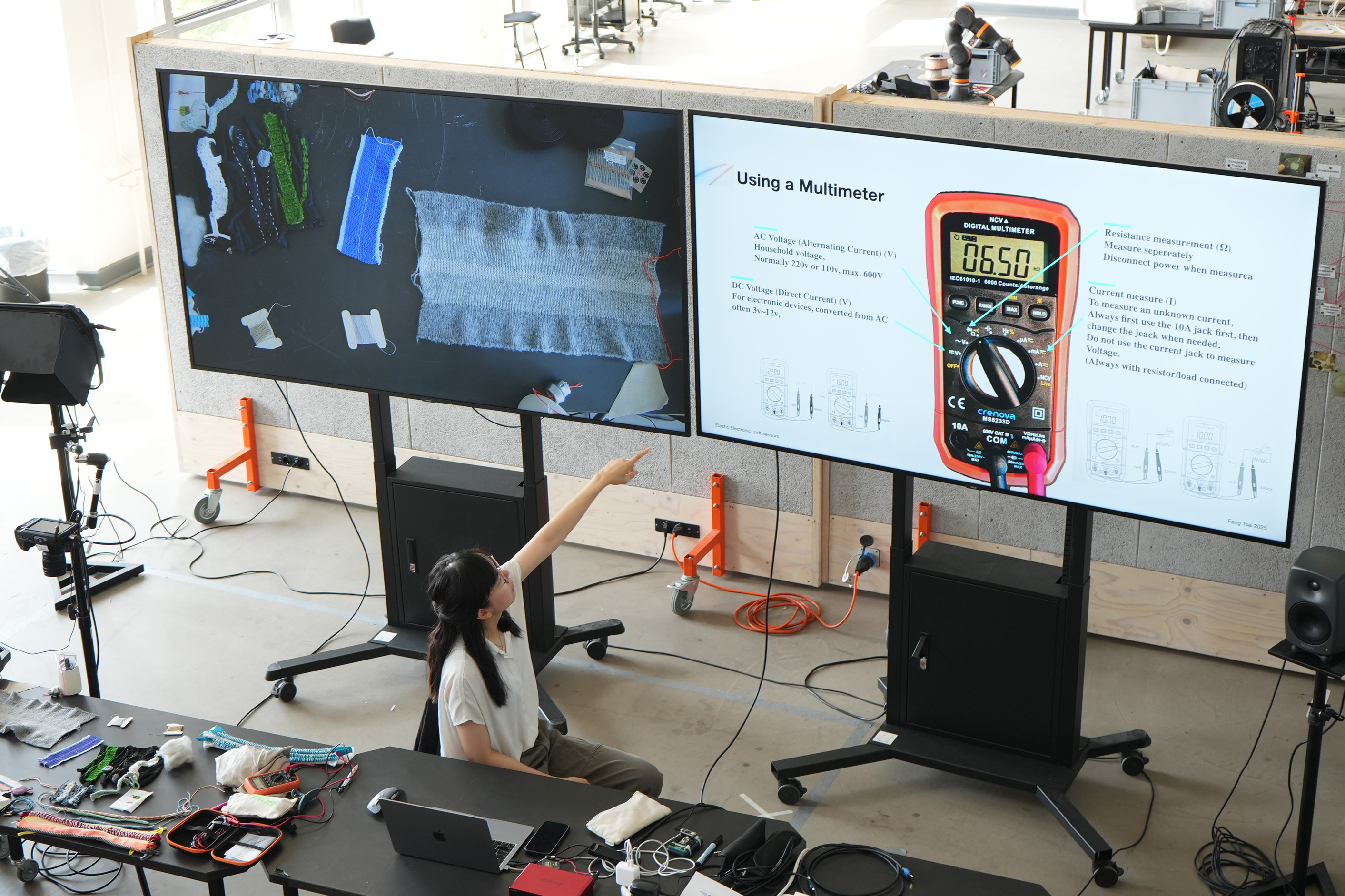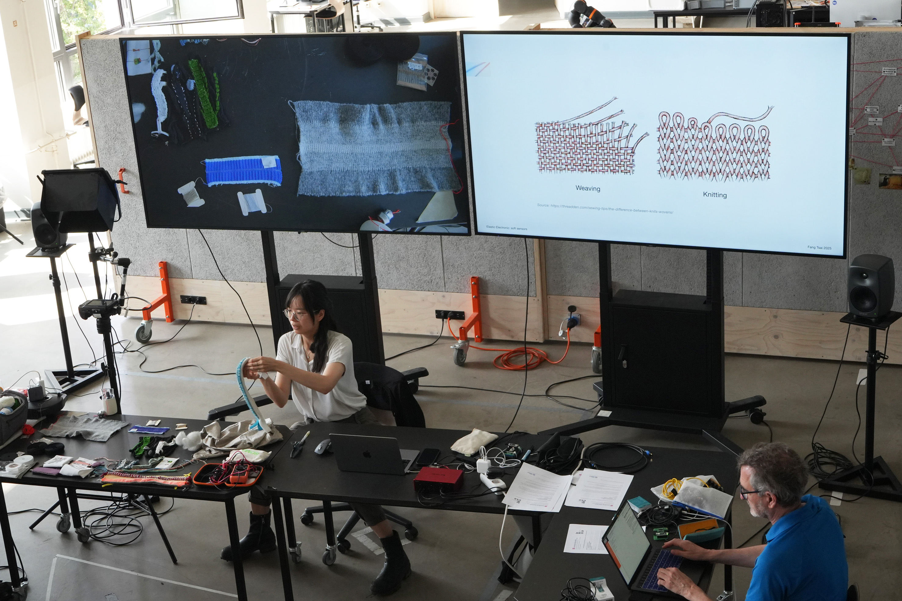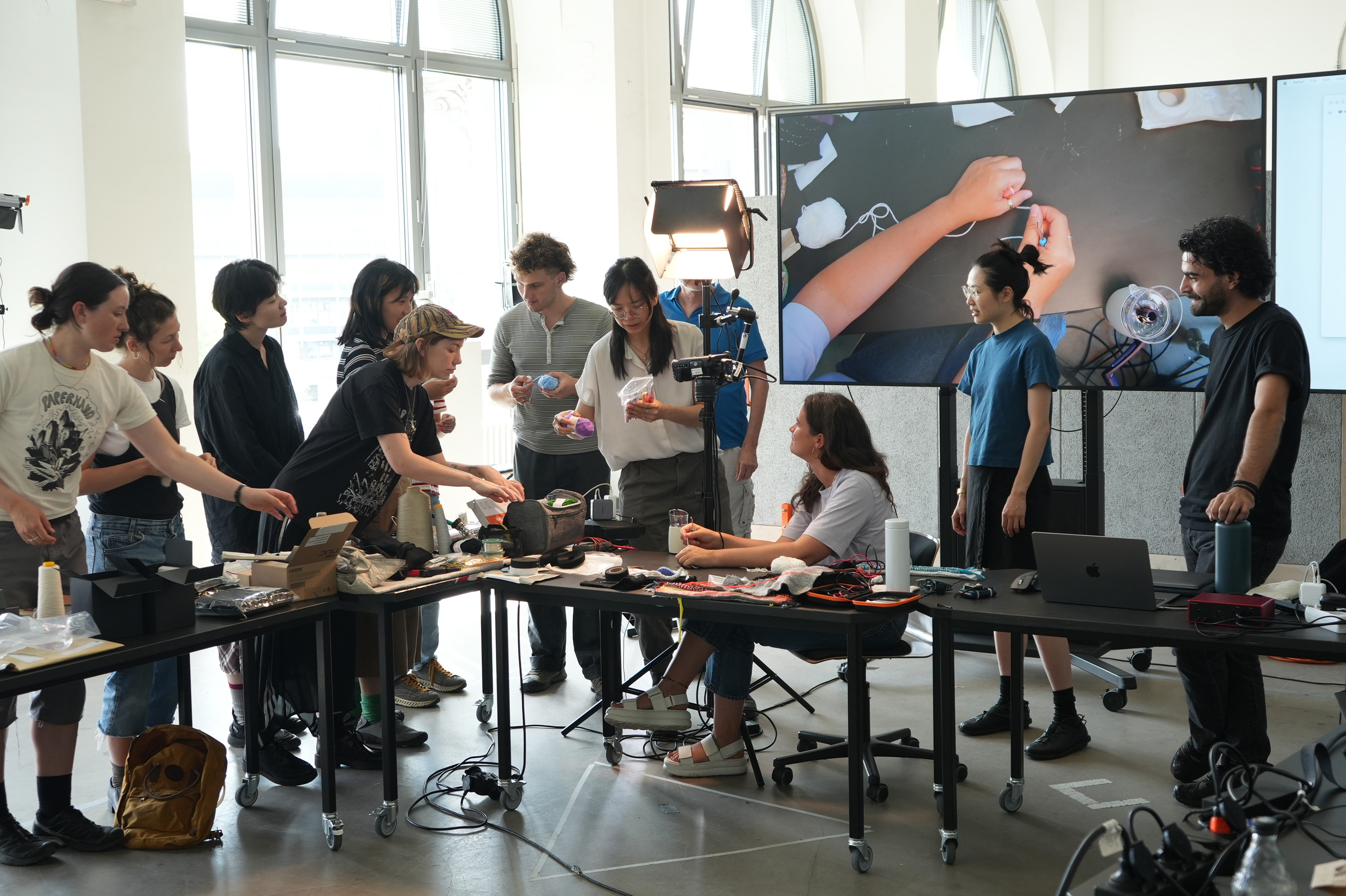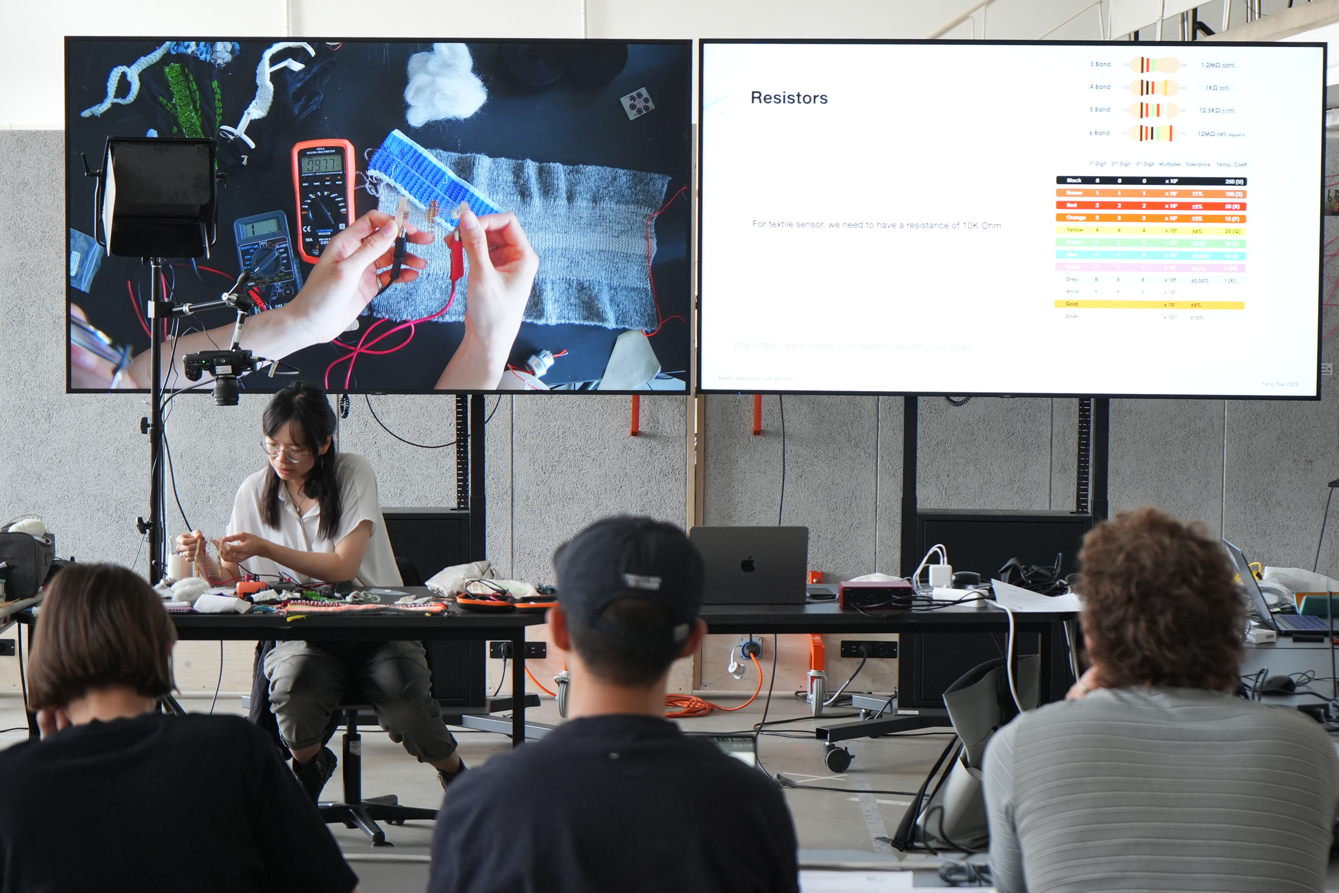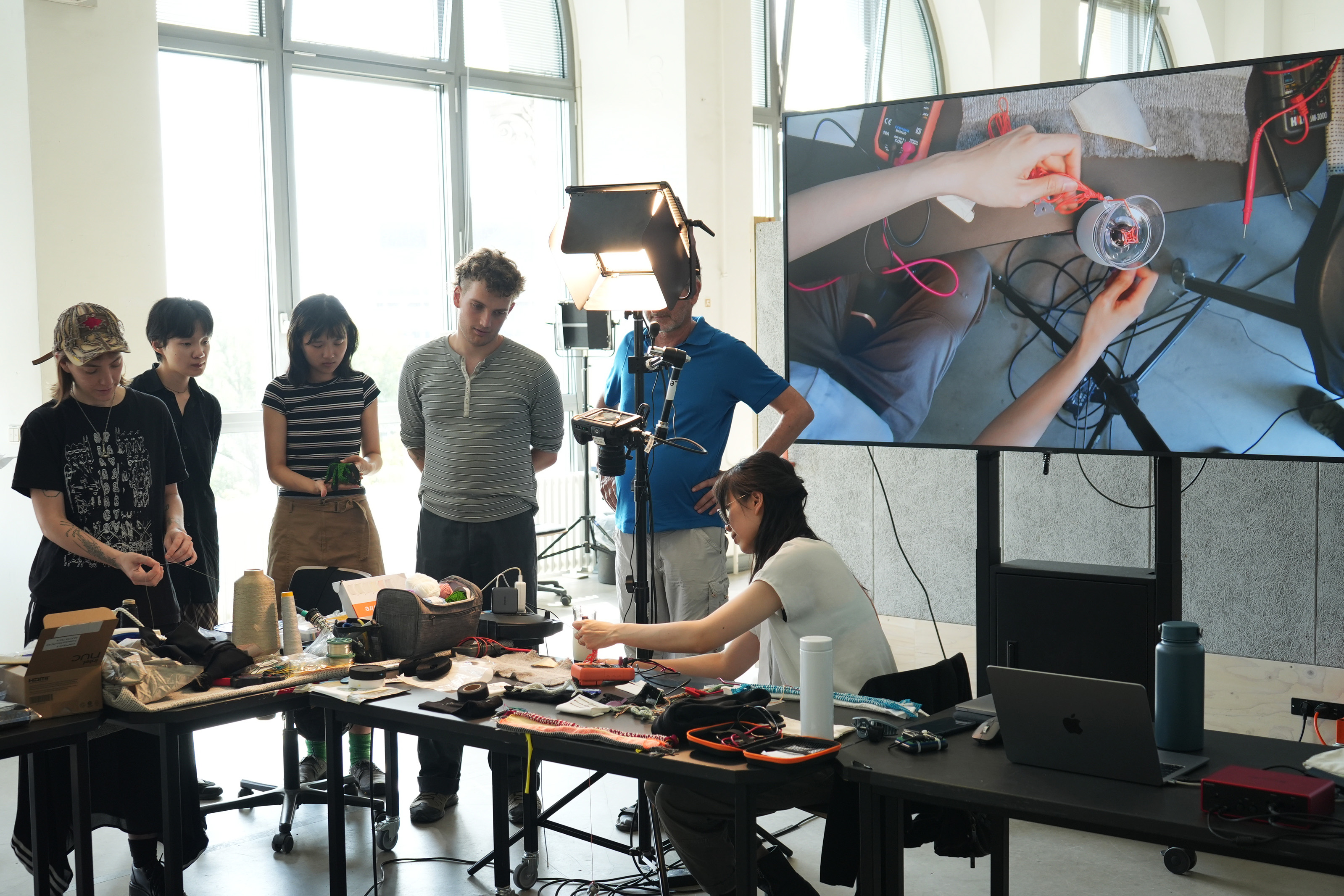 The workshop Elastic Electronic: Soft Sensors, hosted by Fang Tsai at the Design & Computation Studio of the Technical University of Berlin for student from Berlin University of the Arts, offered a hands-on exploration of the intersections between textiles, electronics, and sound. Designed as a transdisciplinary experience, it brought together students from visual communication, dance, product design, sound studies, and fine arts, encouraging collaboration across creative and technical fields.