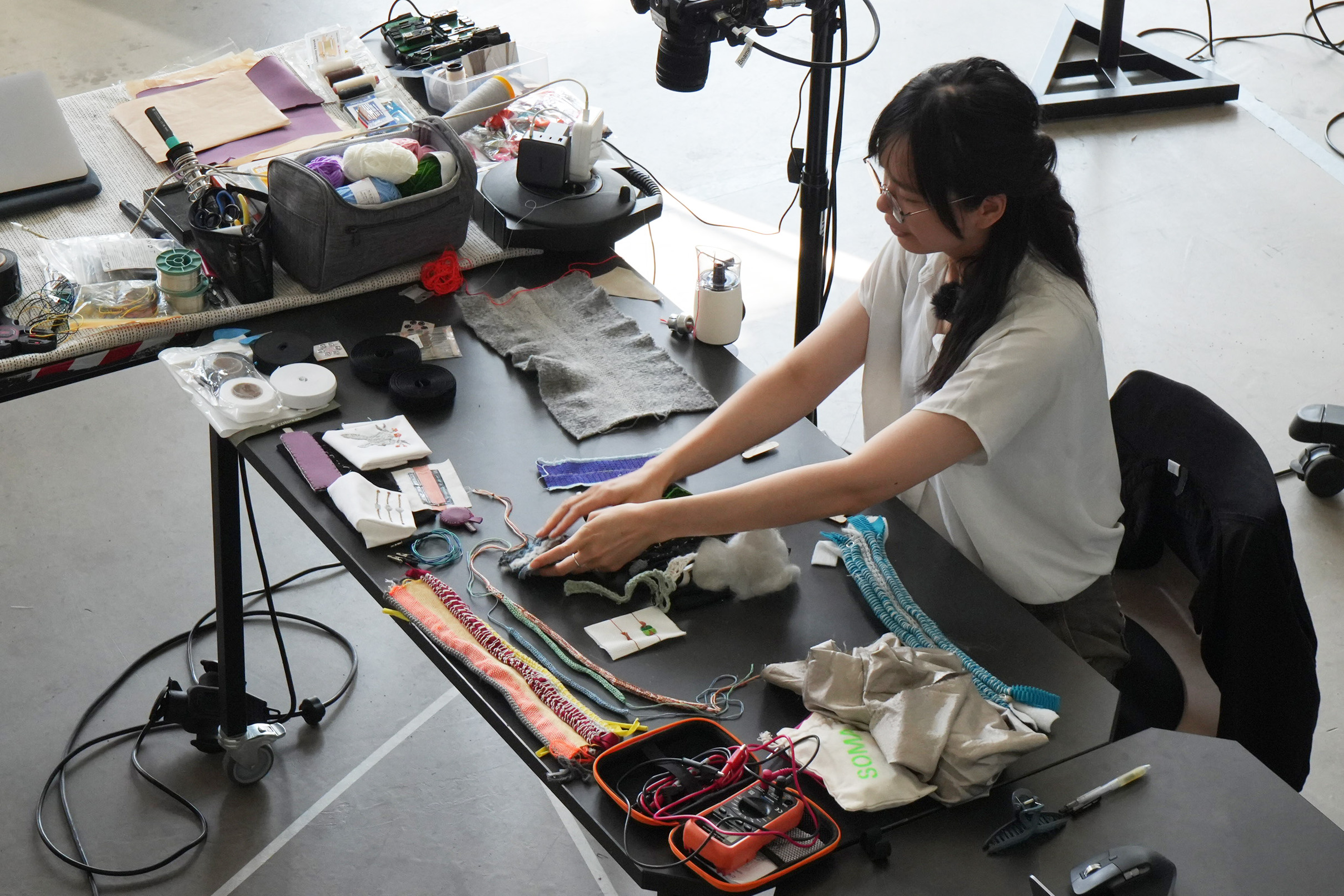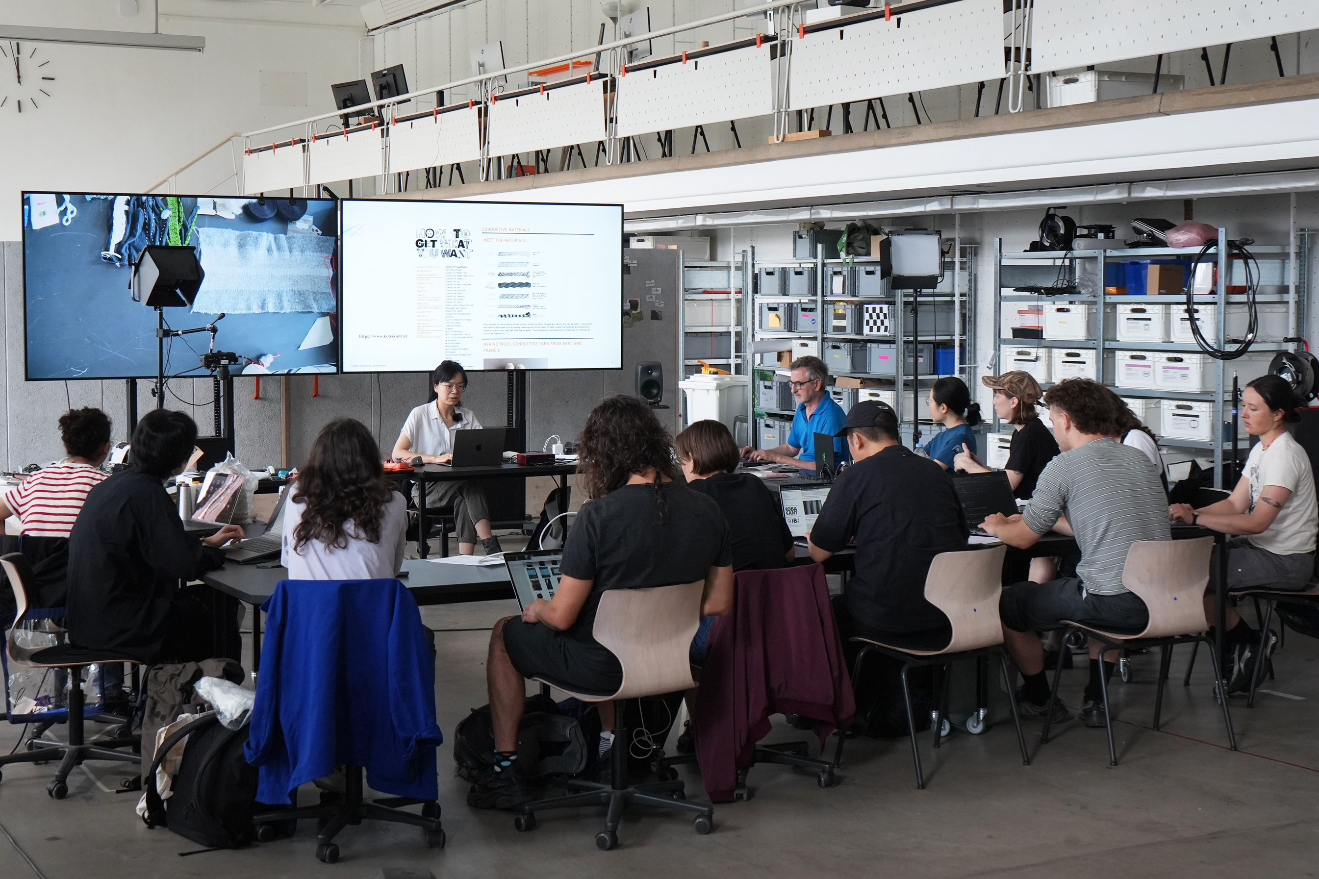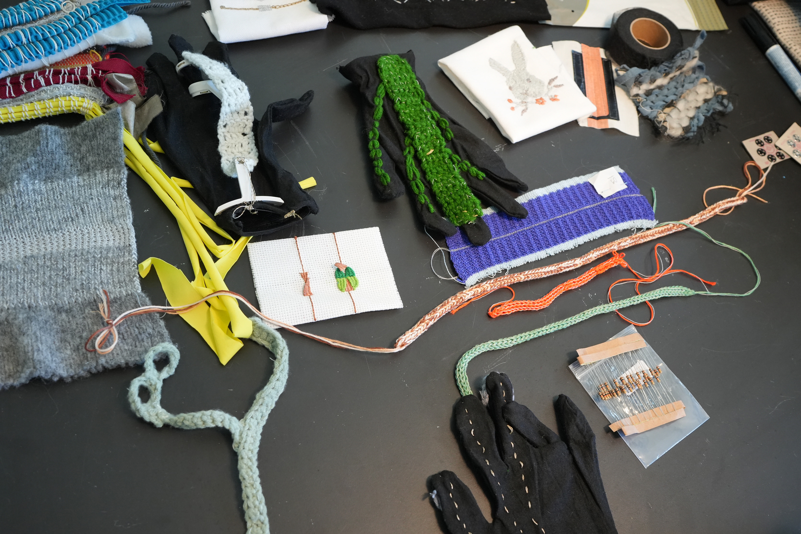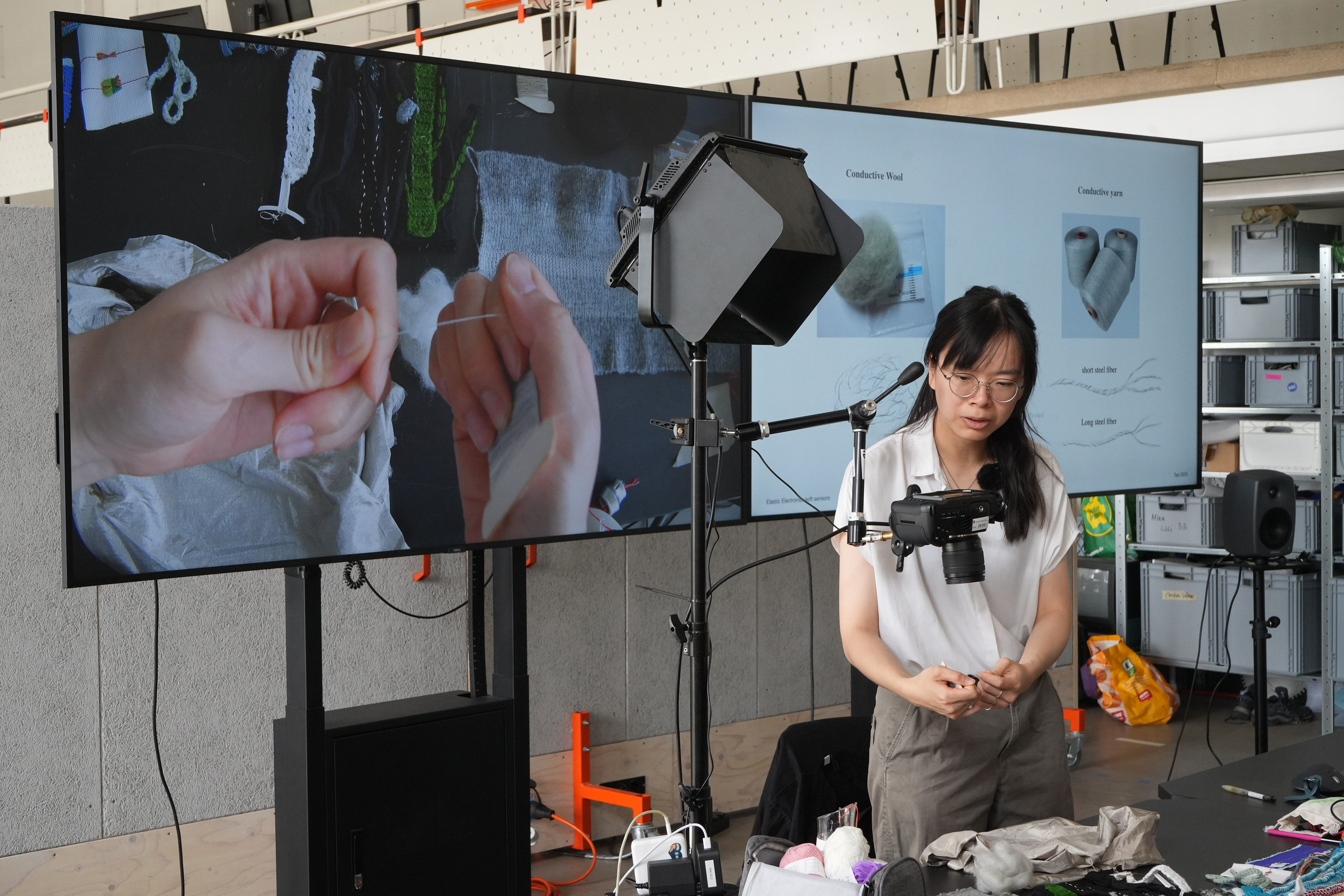 The workshop Elastic Electronic: Soft Sensors, hosted by Fang Tsai at the Design & Computation Studio of the Technical University of Berlin for student from Berlin University of the Arts, offered a hands-on exploration of the intersections between textiles, electronics, and sound. Designed as a transdisciplinary experience, it brought together students from visual communication, dance, product design, sound studies, and fine arts, encouraging collaboration across creative and technical fields.