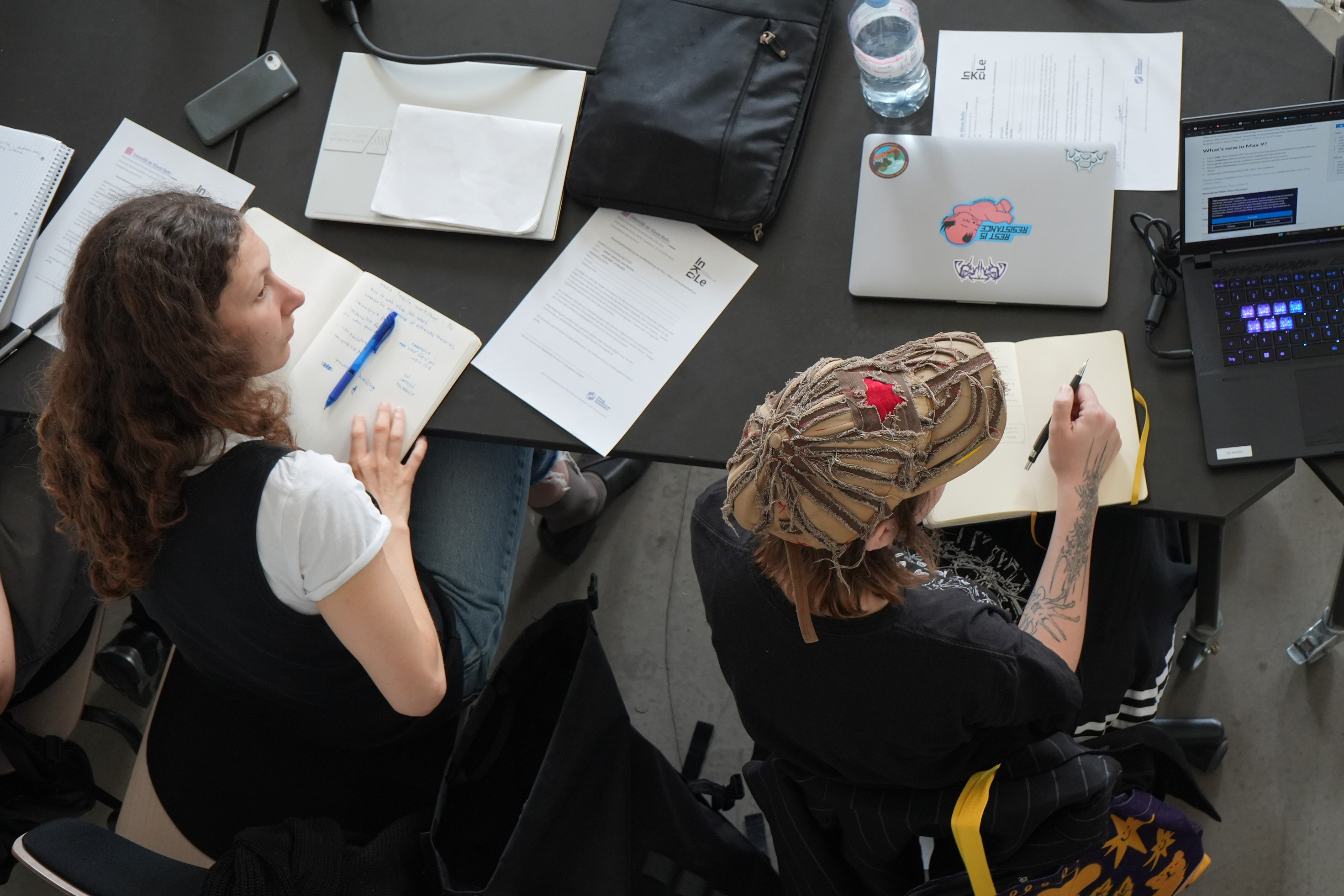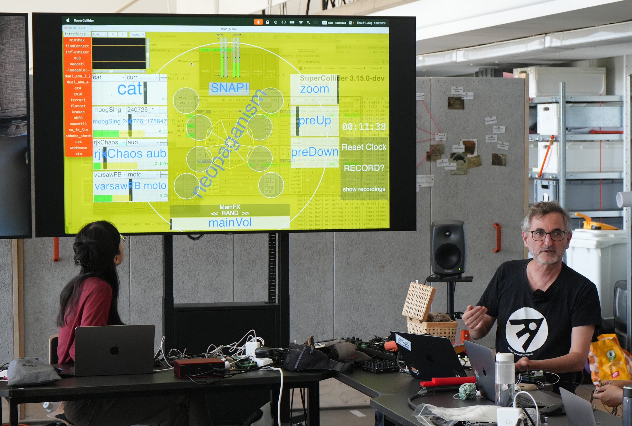 On the second day, the sensors were connected to microcontrollers with custom expansion boards developed by Berit Greinke and Federico Visi. The signals were transmitted to computers and mapped to sound in Max and SuperCollider, enabling participants to explore interactive sonic responses.