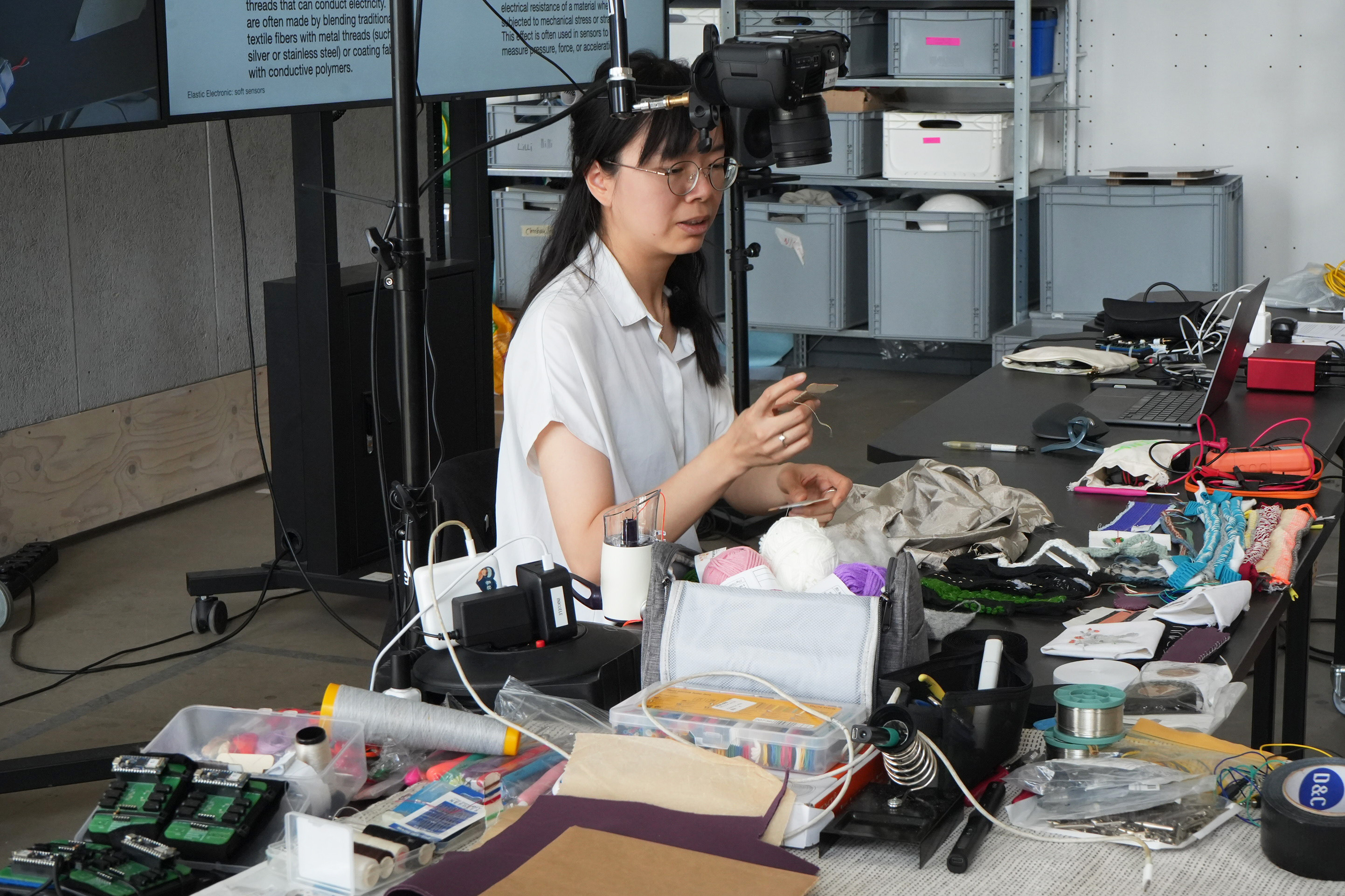 The workshop Elastic Electronic: Soft Sensors, hosted by Fang Tsai at the Design & Computation Studio of the Technical University of Berlin for student from Berlin University of the Arts, offered a hands-on exploration of the intersections between textiles, electronics, and sound. Designed as a transdisciplinary experience, it brought together students from visual communication, dance, product design, sound studies, and fine arts, encouraging collaboration across creative and technical fields.
