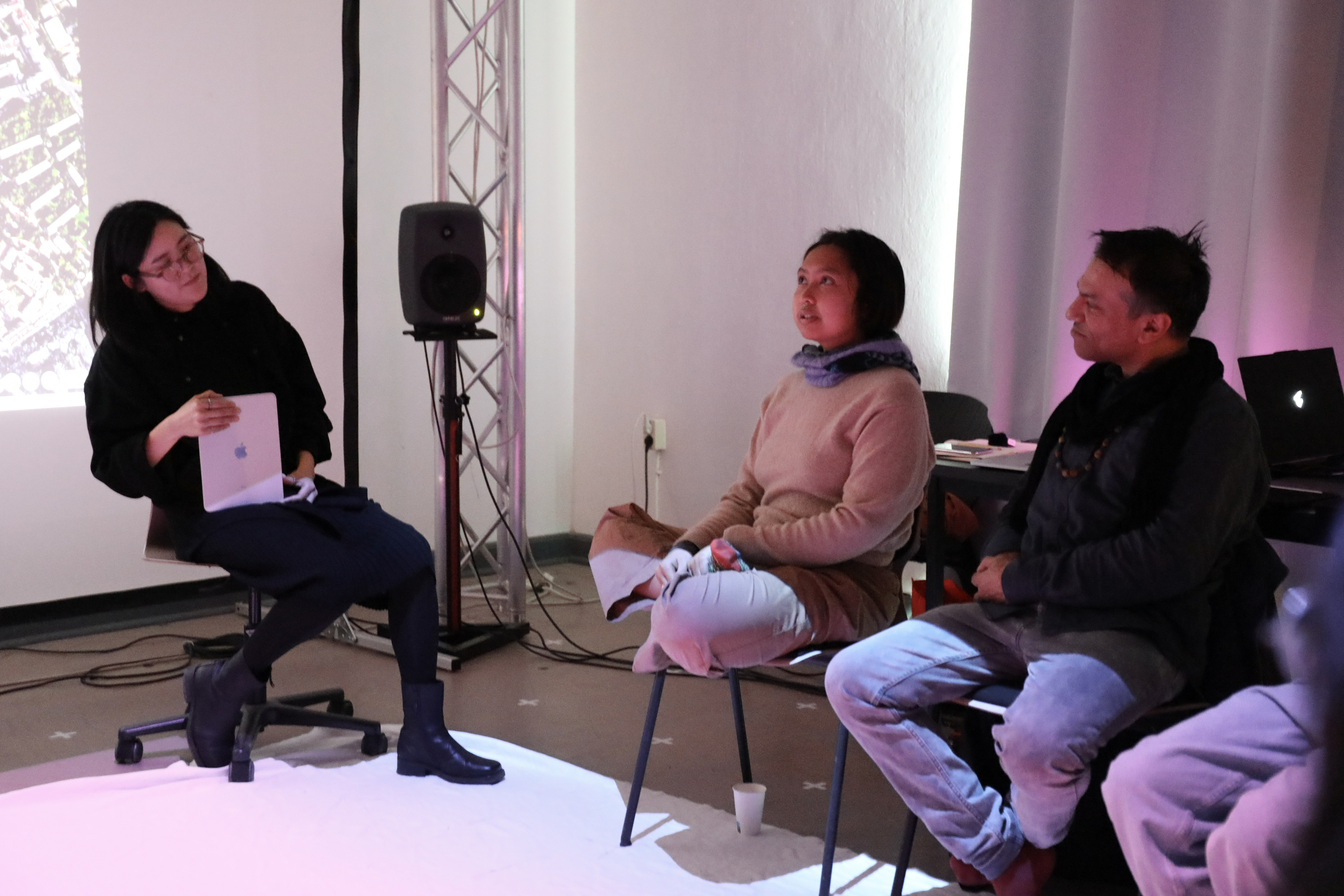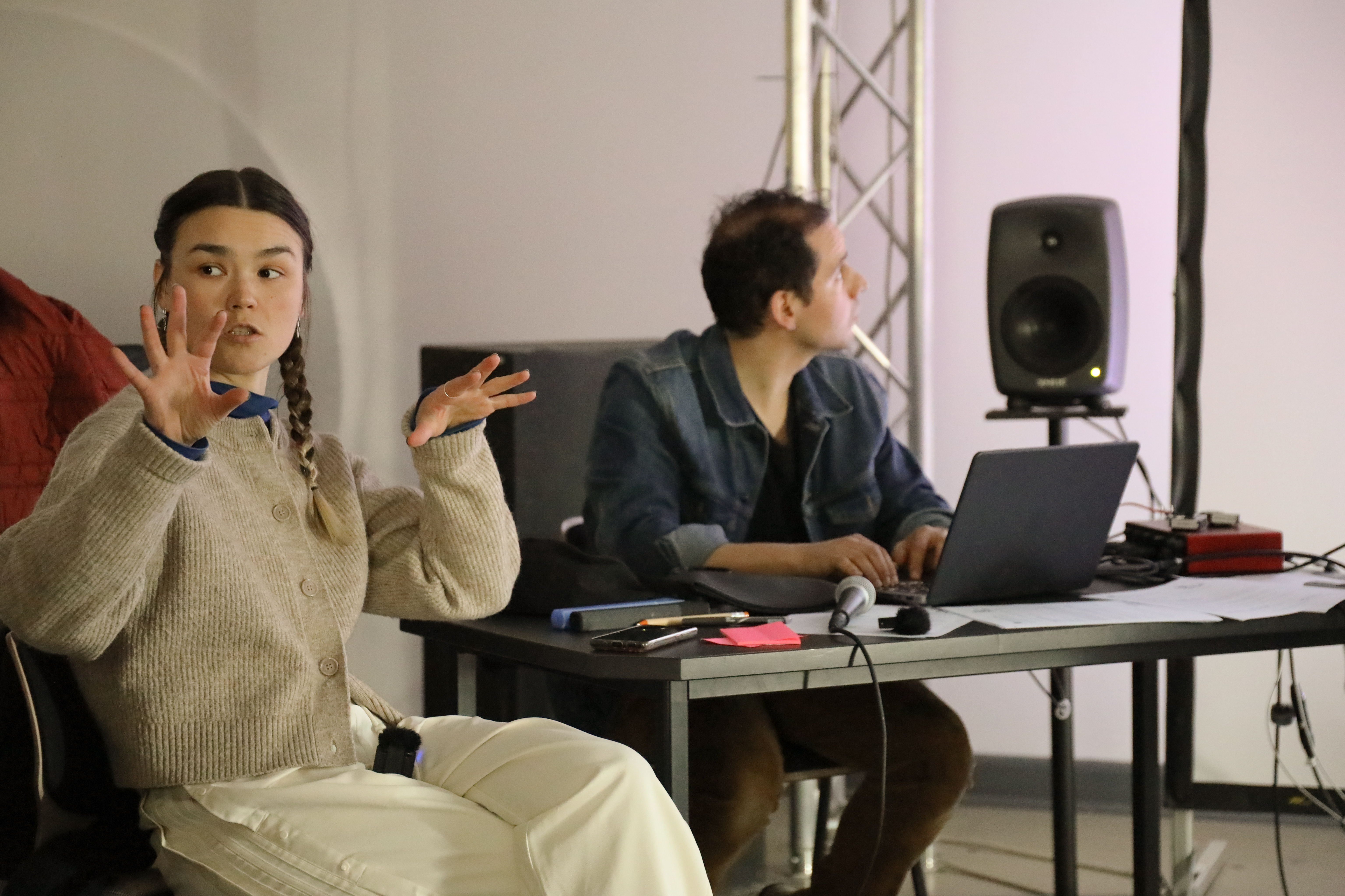 Hybrid Bodies workshop I: Disembodiment and Spatiality of Voice, led by Maryna Makarenko and Özcan Ertek with InKüLe support from Fang Tsai and Franz Siebler, explored voice as a medium of identity and embodiment. Participants engaged in deep-listening exercises, vocal warm-ups, and recording practices, experimenting with modulation and digital processing. The workshop concluded with a collaborative choral composition, in which voices were layered and transformed to challenge conventional understandings of gender and identity.